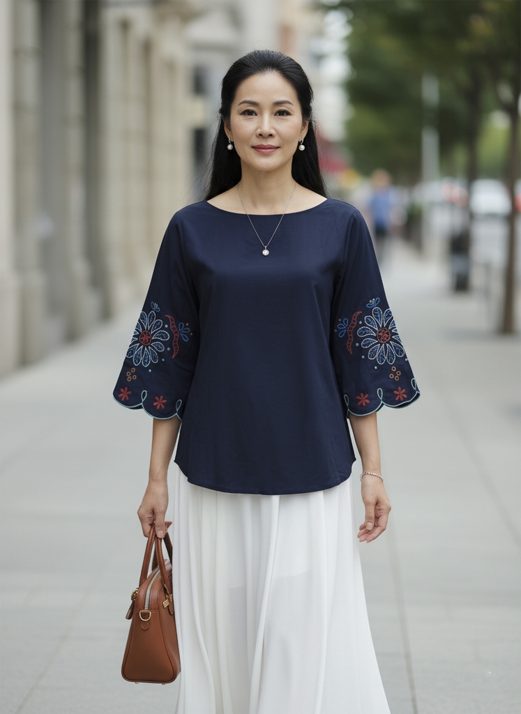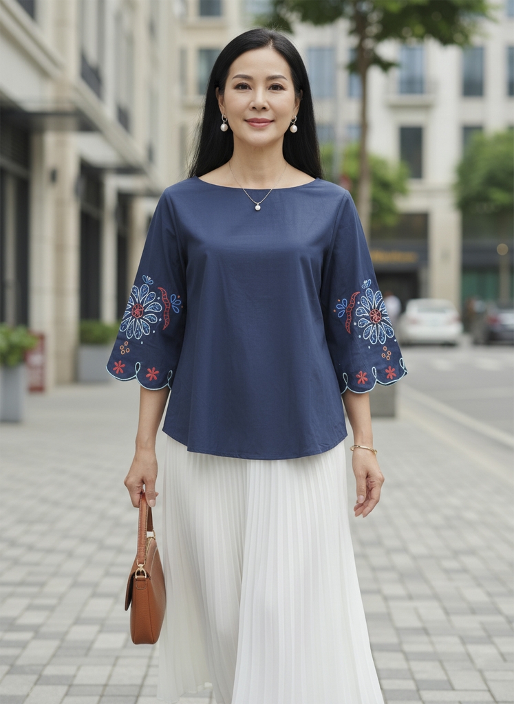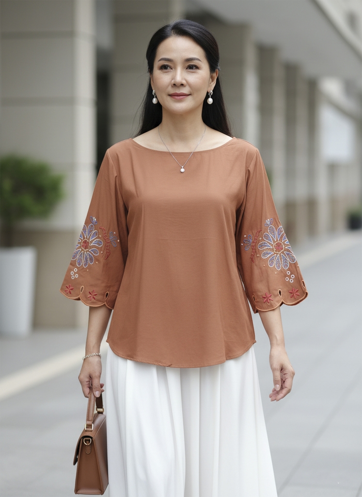 M COLLECTION | Áo Kiểu Nữ Trung Niên Tặng Mẹ Bà Cổ Tròn Tay Lỡ Vải Lụa Ý Thêu Hoa Cao Cấp A12866