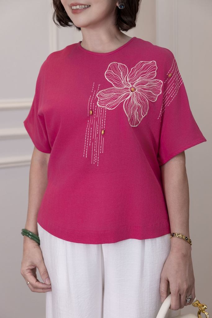 M COLLECTION | Áo Kiểu Nữ Trung Niên Tặng Mẹ, Bà Linen Thêu Hoa Cổ Tròn Tay Ngắn Cánh Dơi A12942