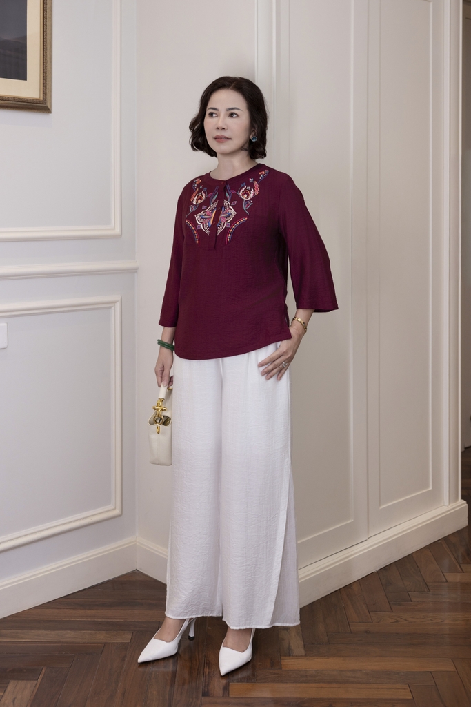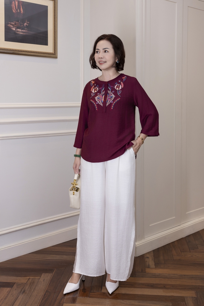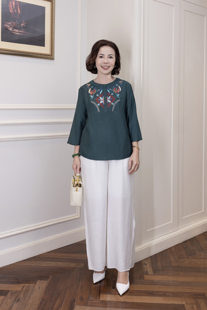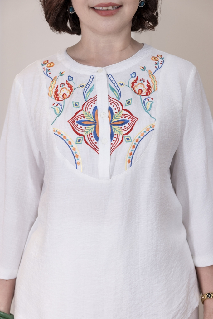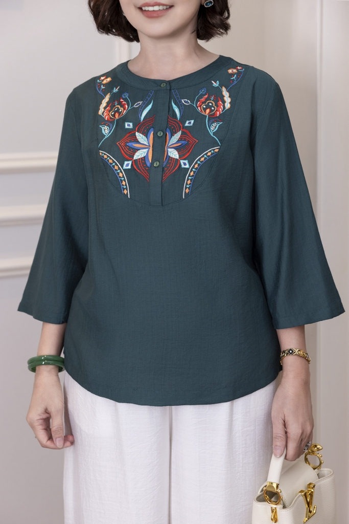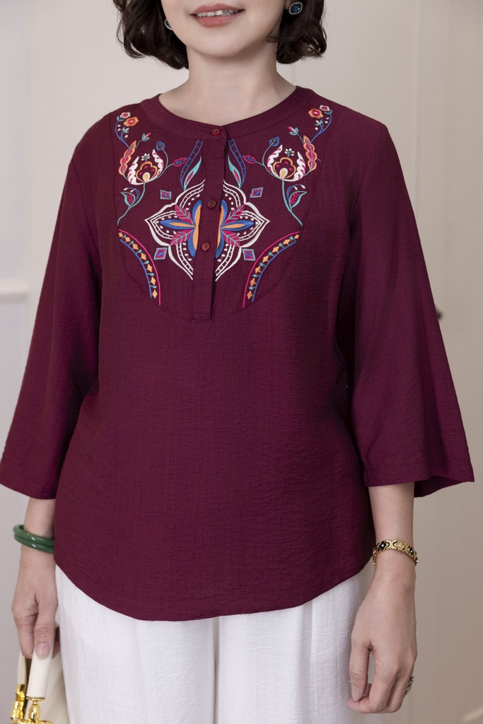 M Collection | Áo Kiểu Trung Niên Tặng Mẹ Cổ Tròn Cài Nút Tay Lỡ Thêu Hoa Chất Vải Lụa Hàn A13107LW01