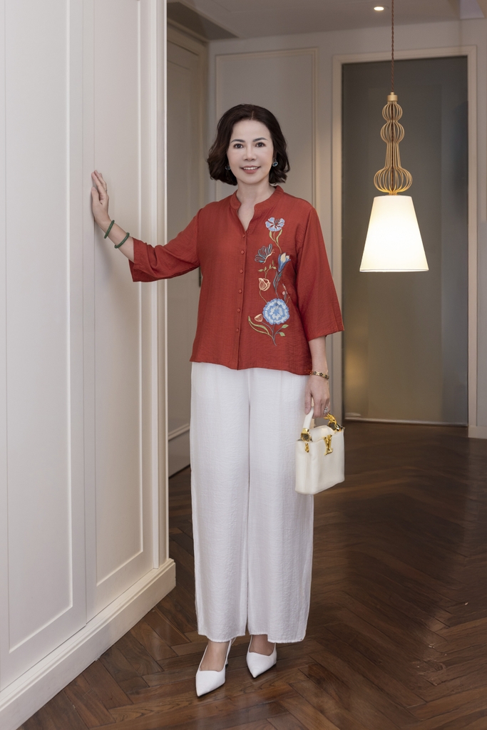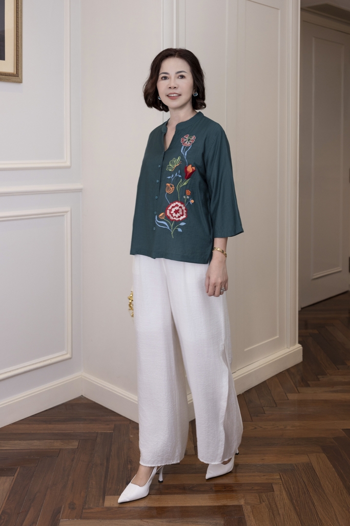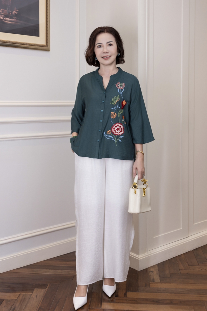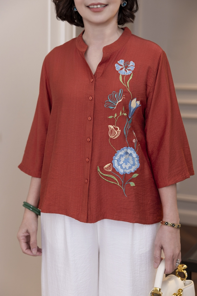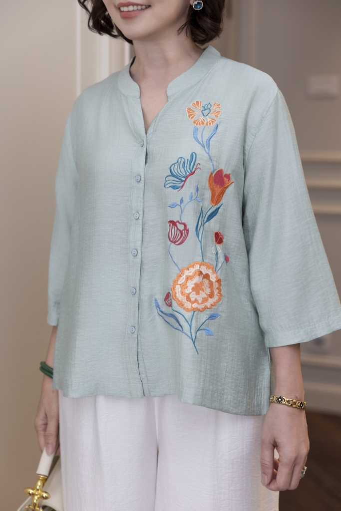 M COLLECTION | Áo Nữ Trung Niên Tặng Mẹ Cổ Trụ Lụa Hàn Cài Nút Tay Lỡ Thoáng Mát Thêu Hoa A13043LW01