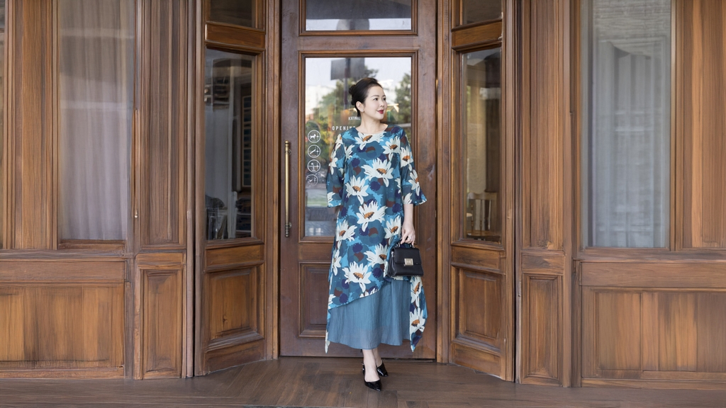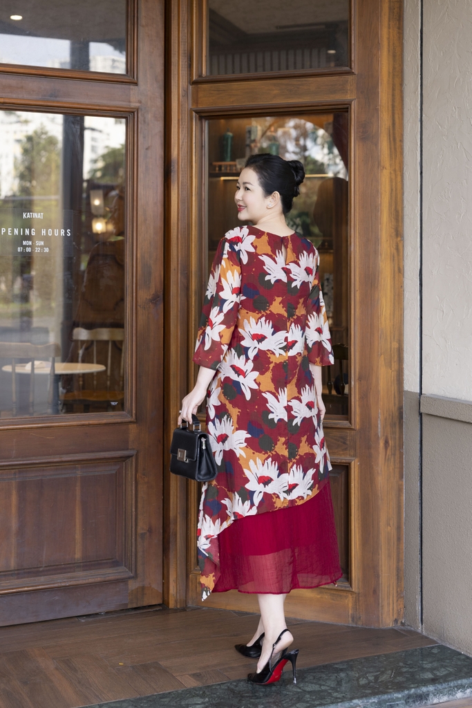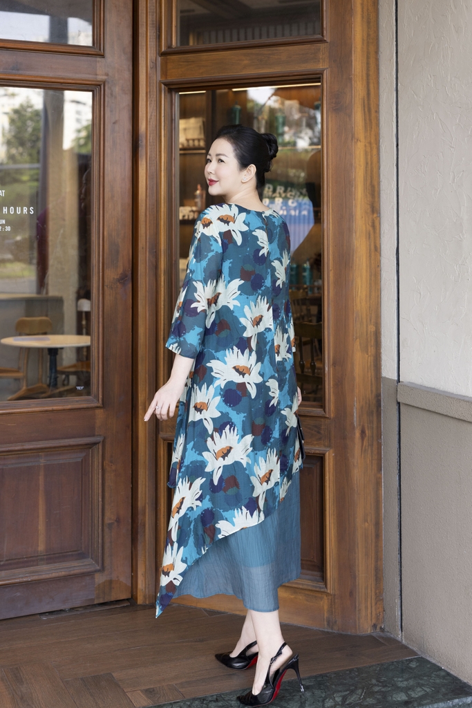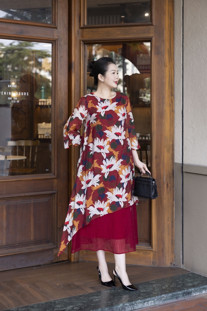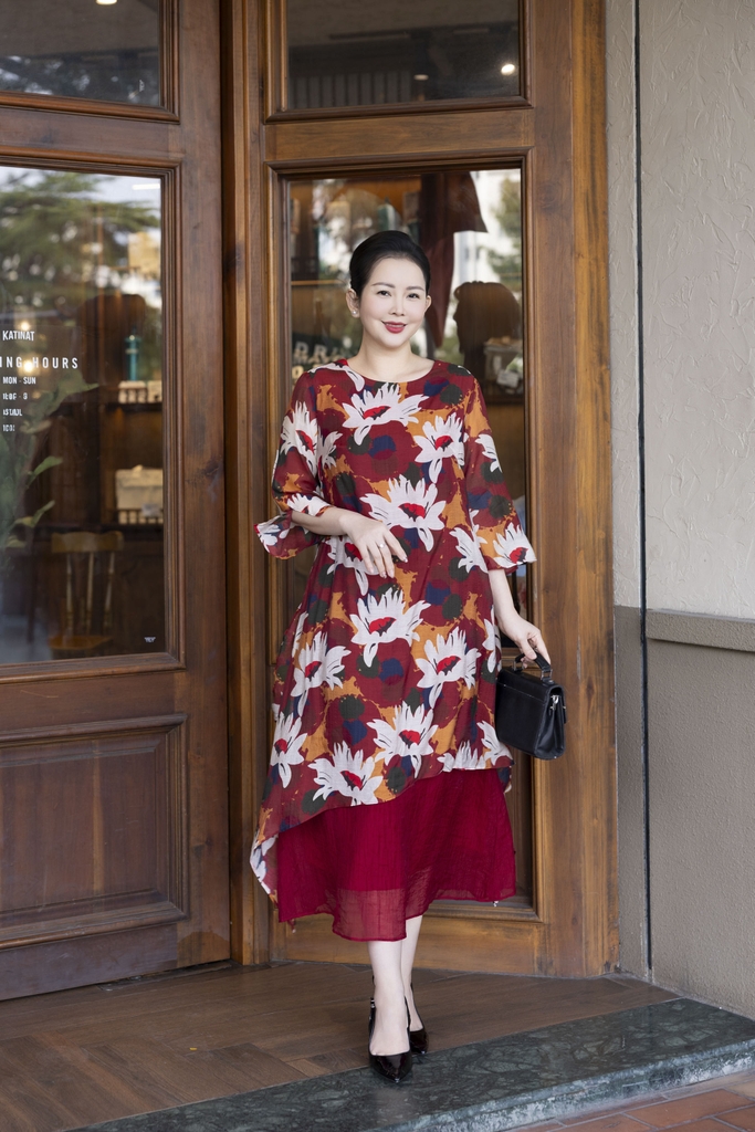 M COLLECTION | Váy Đầm Nữ Trung Niên Tặng Mẹ, Bà Suông Tơ 2 Lớp Cổ Tròn Tay Lỡ In Hoa D13247LW01