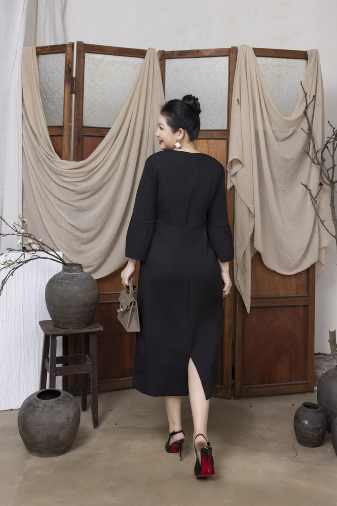 M COLLECTION | Váy Đầm Nữ Trung Niên Tặng Mẹ Cổ Tròn Lụa Dày Đính Hoa Nổi Tay Dài Nhấn Eo D13242LW01