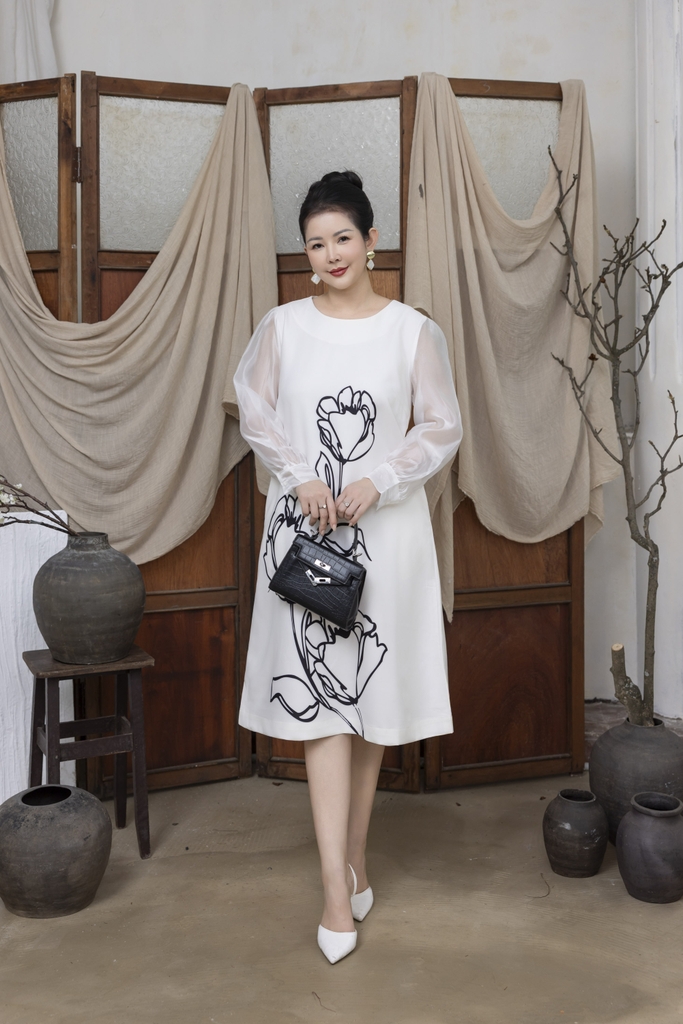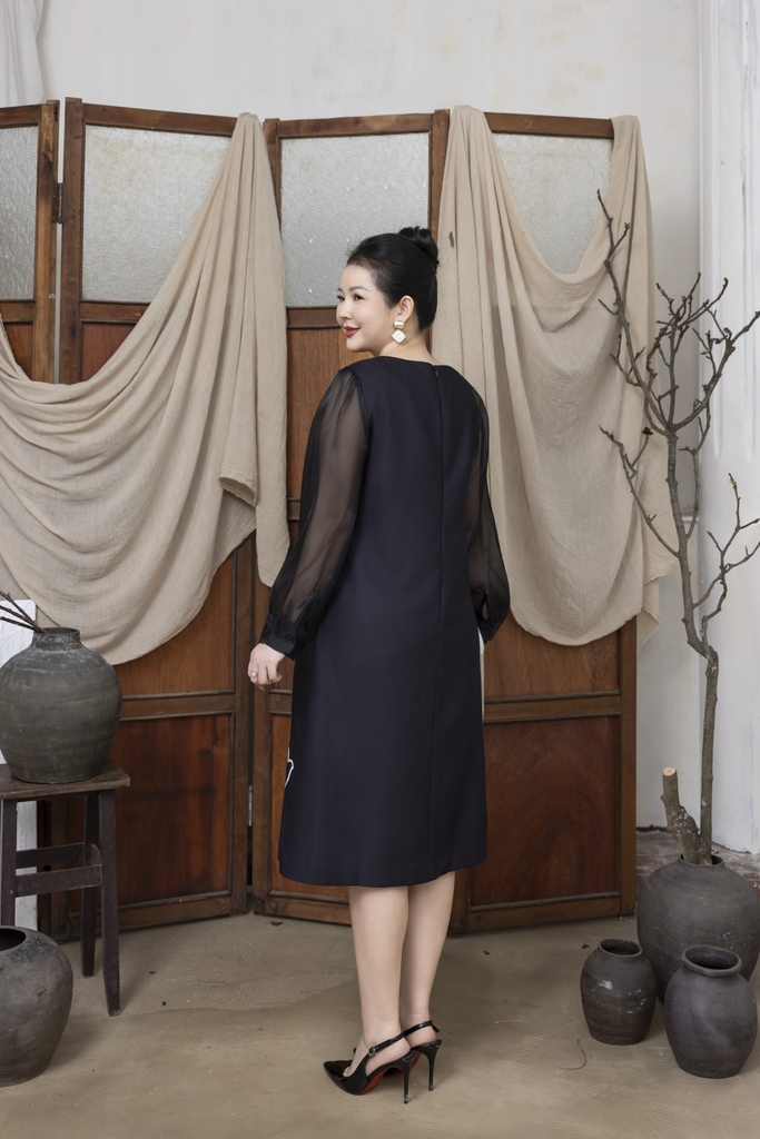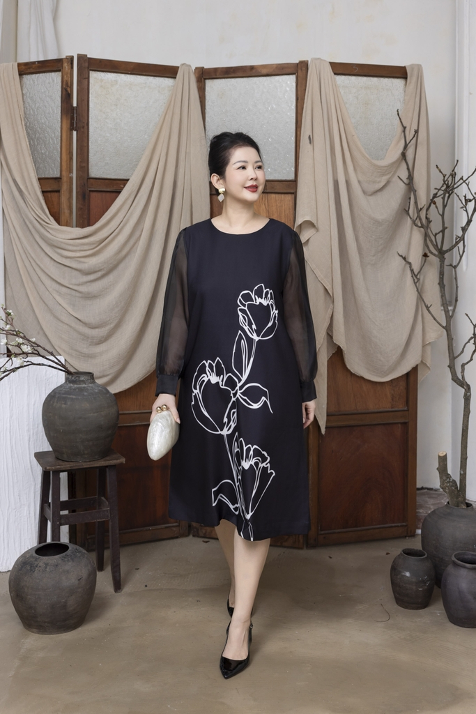 M COLLECTION | Váy Đầm Nữ Trung Niên Tặng Mẹ Suông Cổ Tròn Lụa Dày Thêu Hoa Tay Dài Đi Tiệc D13275LW01