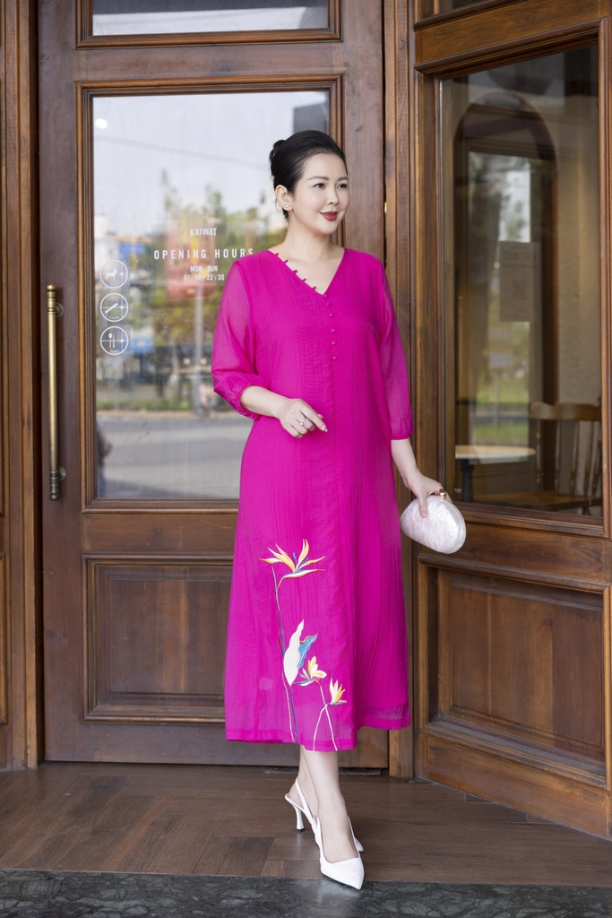 M COLLECTION | Váy Đầm Suông Nữ Trung Niên Tặng Mẹ, Bà Vải Đũi Hàn Thêu Hoa Hai Lớp Đính Nút D13276LW01