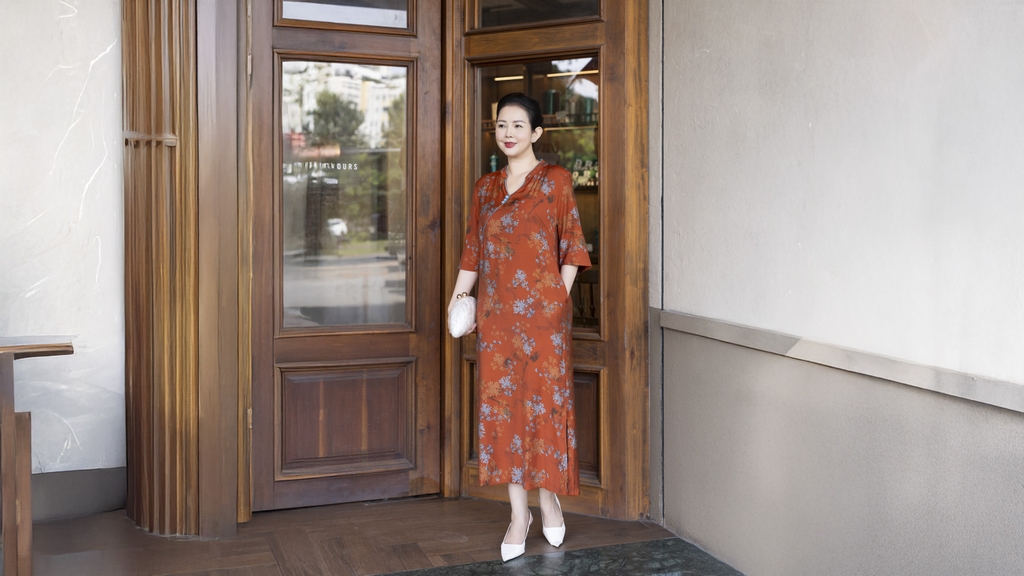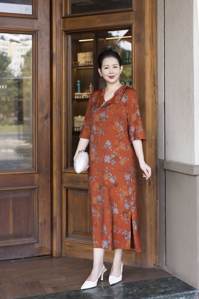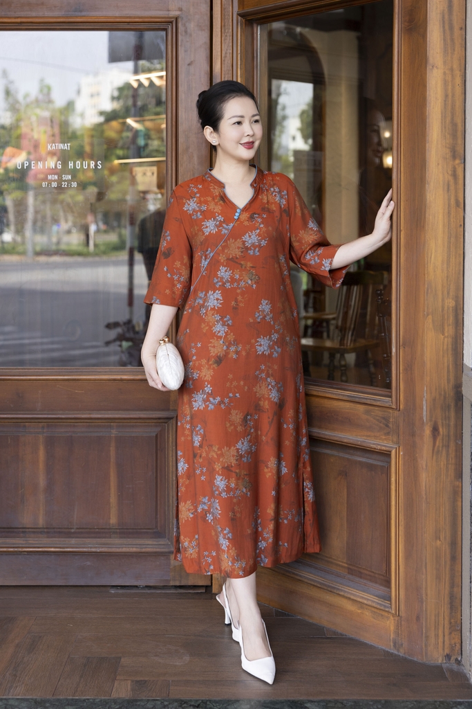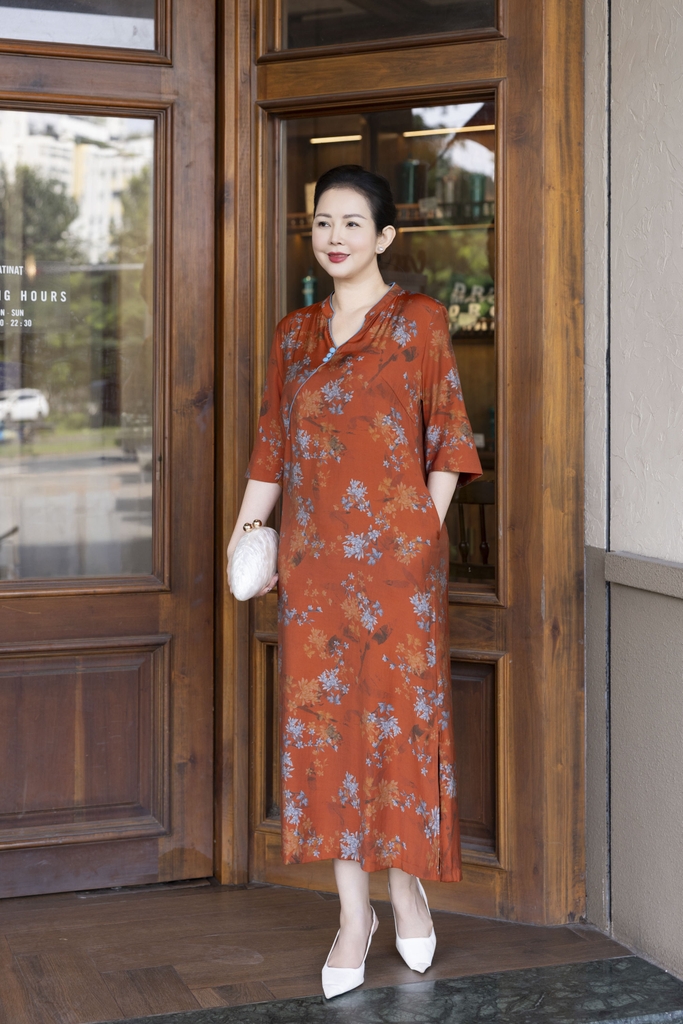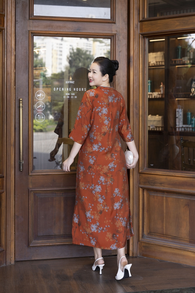 M COLLECTION | Váy Đầm Suông Nữ Trung Niên Tặng Mẹ, Bà Vải Lụa Bông Cao Cấp Cổ Trụ Tay Lỡ D13271LW01