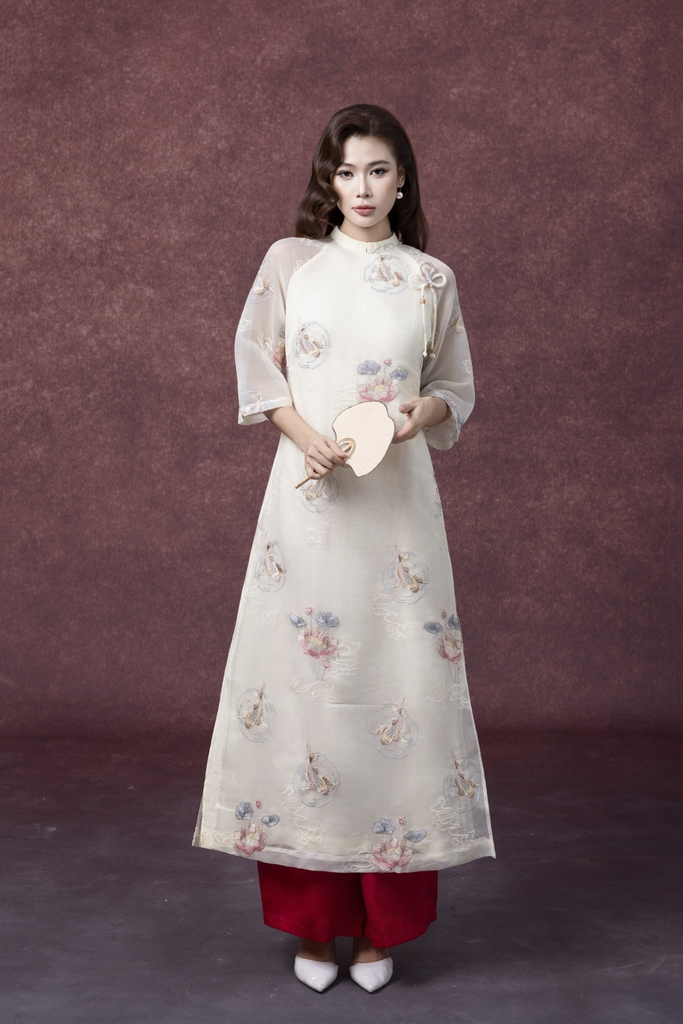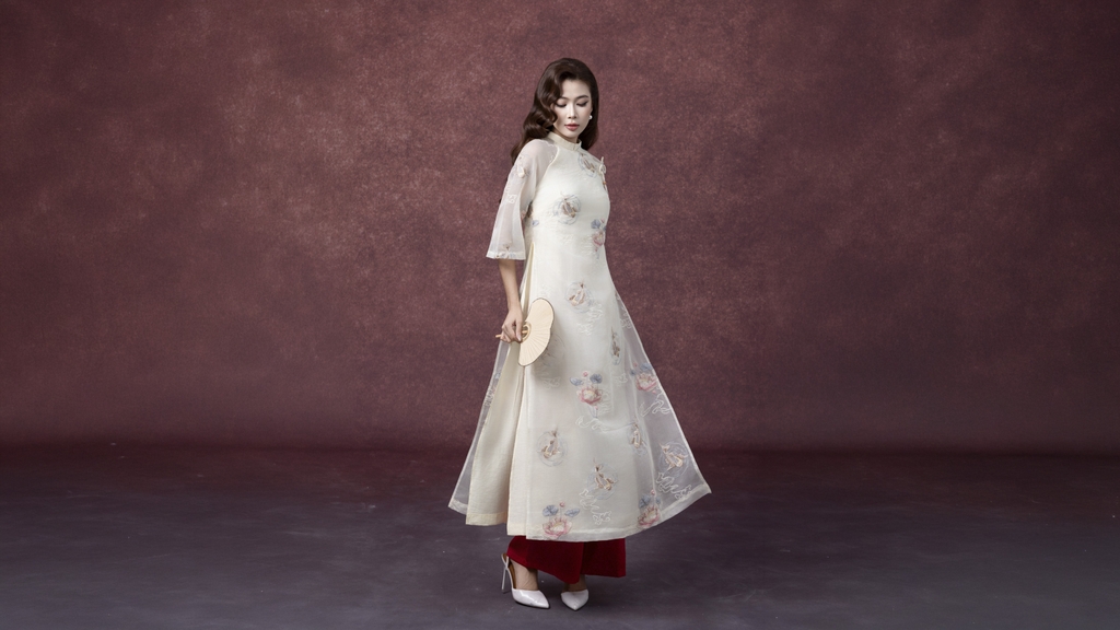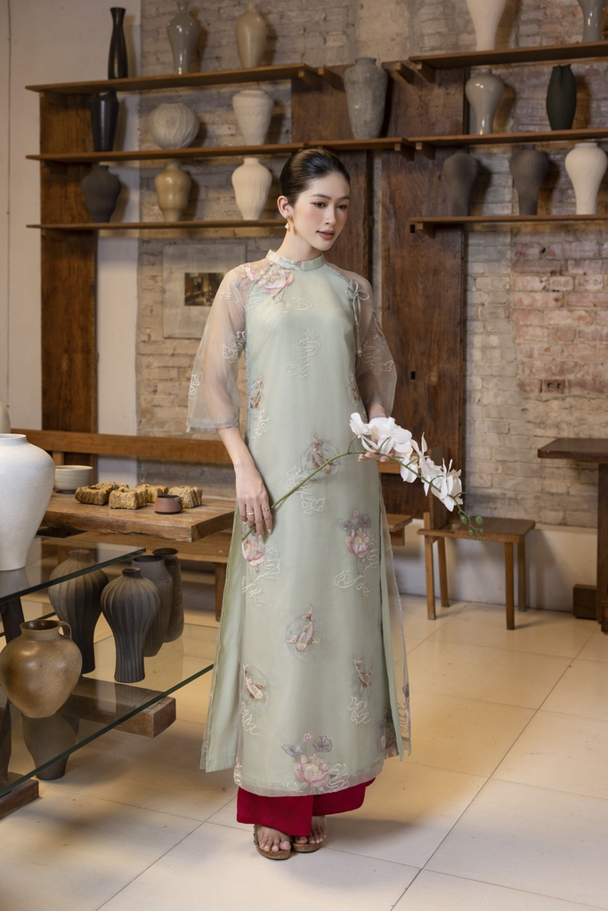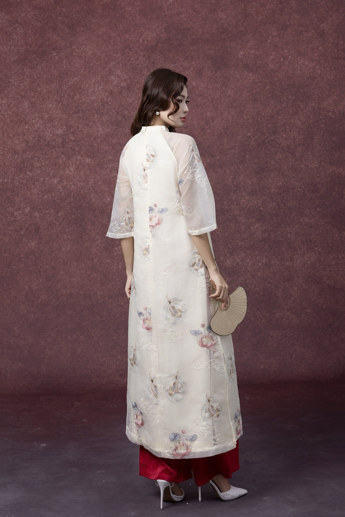 SWANLAKE | Áo Dài Cách Tân Nữ Phom Suông Tà Kép Cổ Trụ Chất Vải Tơ Ép Thêu Hoa Tay Lỡ L13254LW01