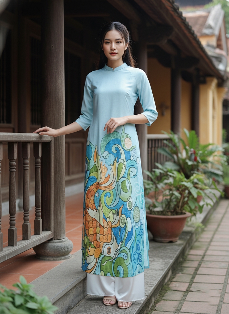 SWANLAKE | Áo Dài Nữ Cách Tân Vũ Môn Phom Suông Cổ Trụ Vải Linen Lụa In Họa Tiết Cá Chép Tết L13097LW01