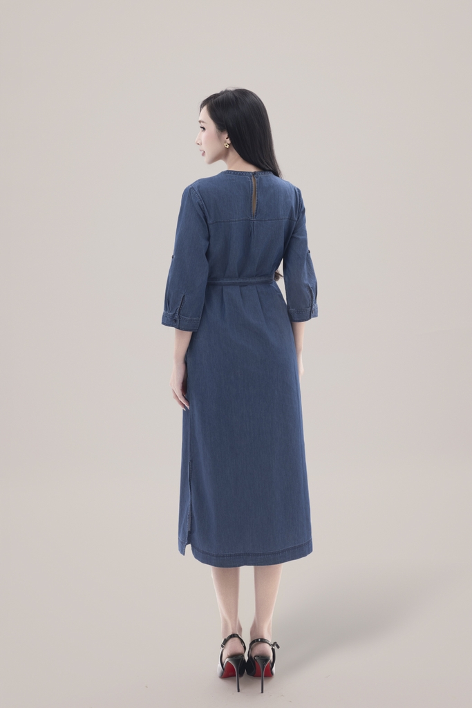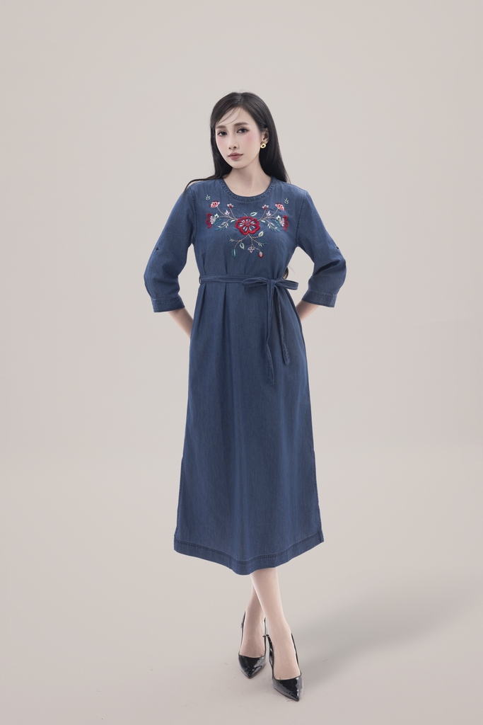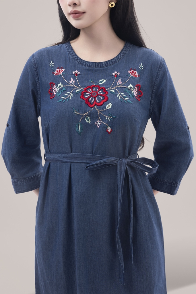 SWANLAKE | Váy Đầm Denim Phom Suông Xẻ Tà Tay Lỡ Cổ Tròn Vải Jean Wash Thêu Hoa Dây Thắt Eo D13016LW01