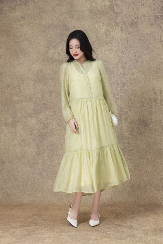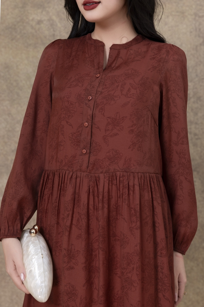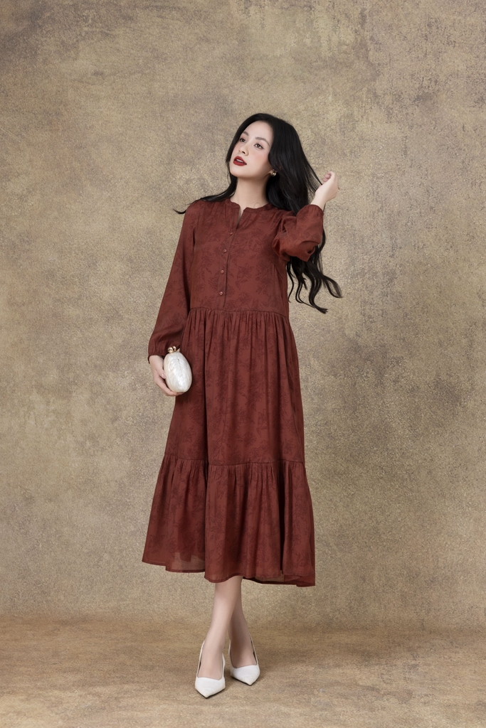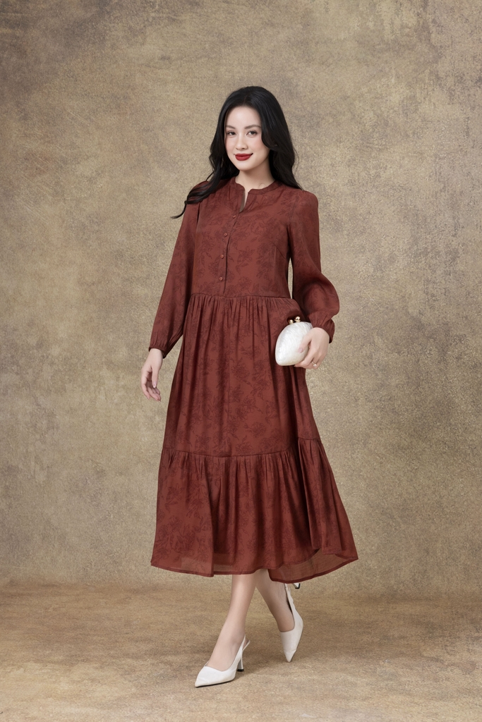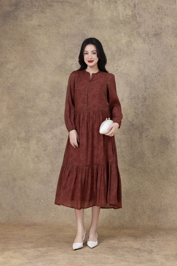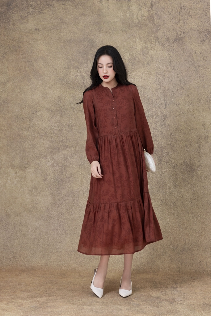 SWANLAKE | Váy Đầm Maxi Nữ Hai Lớp Rời Cổ Trụ Tay Dài Cài Nút Chất Tơ In Lót Lụa Hàn Đi Tiệc D12073LW10