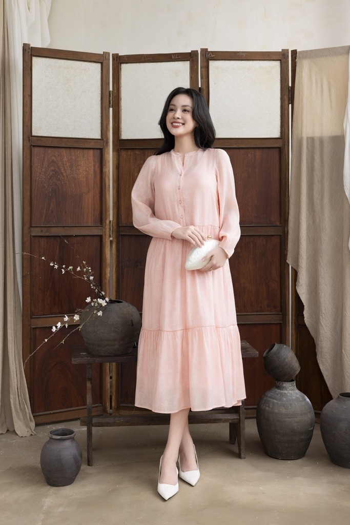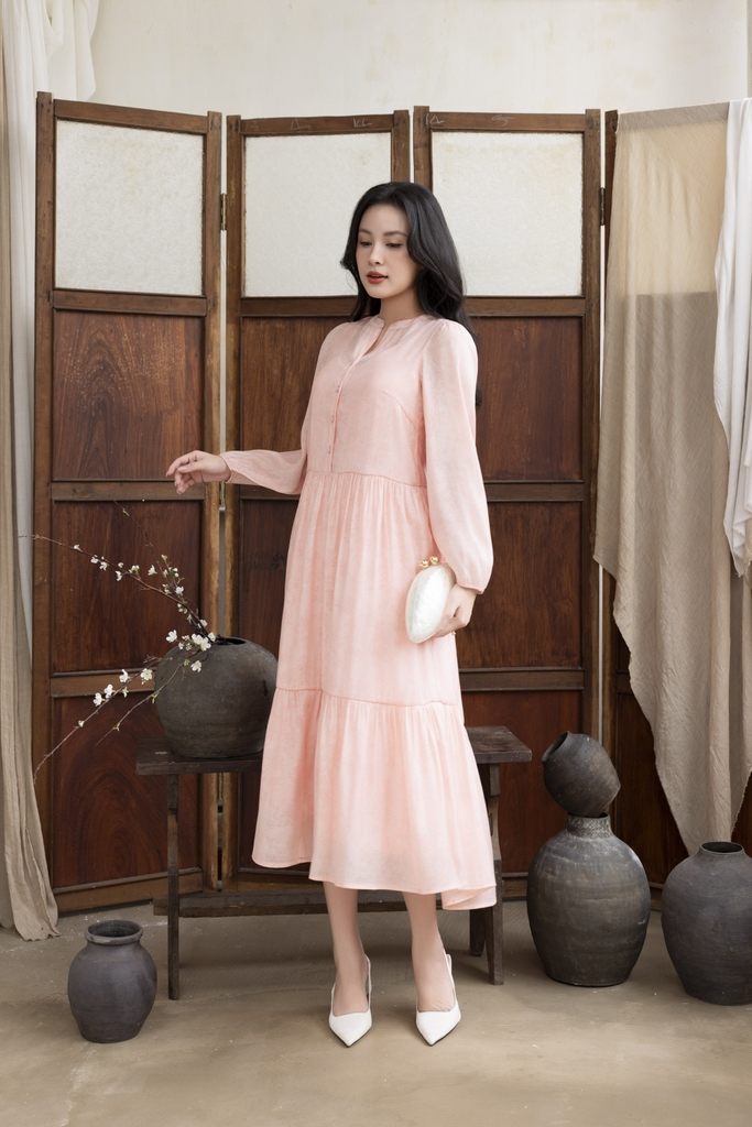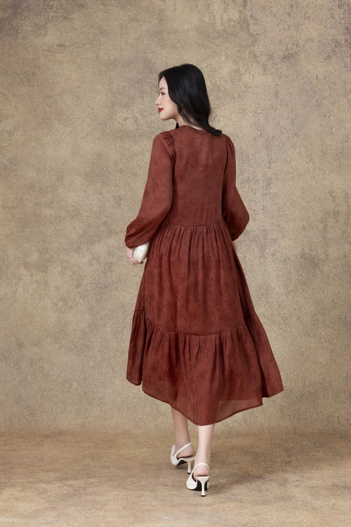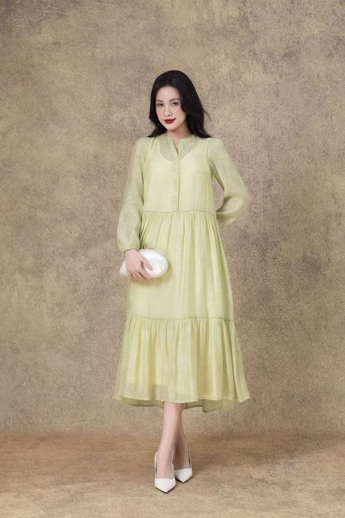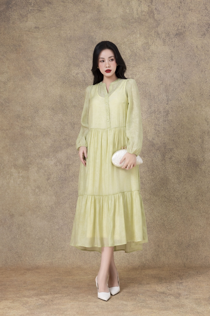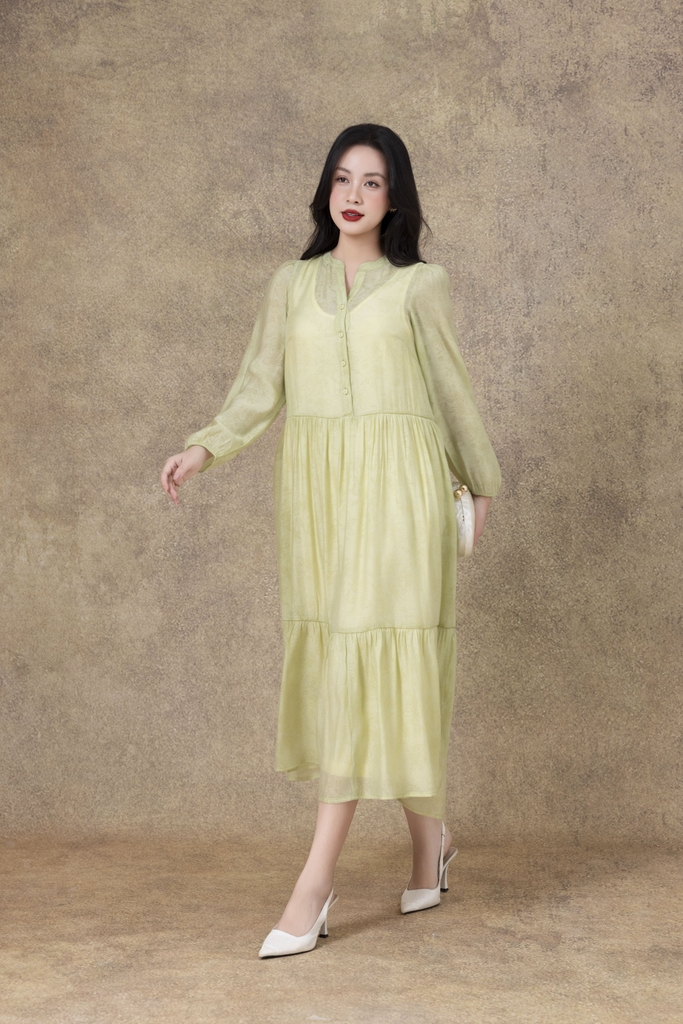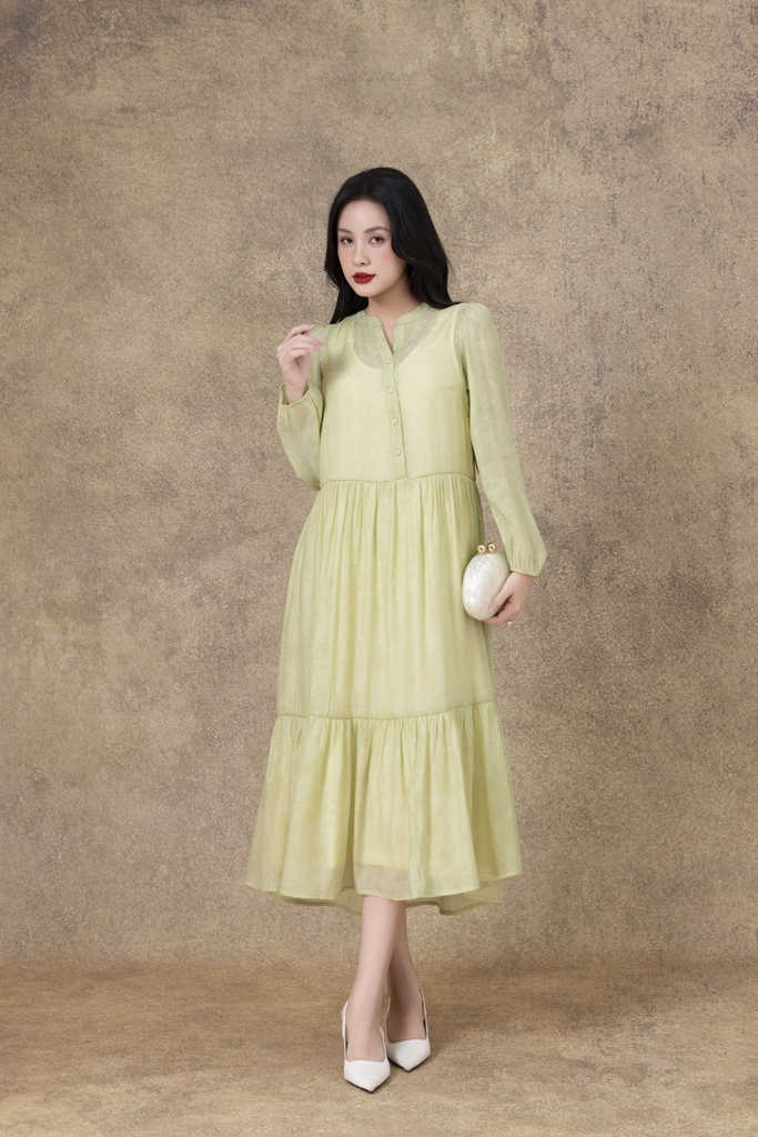 SWANLAKE | Váy Đầm Maxi Nữ Hai Lớp Rời Cổ Trụ Tay Dài Cài Nút Chất Tơ In Lót Lụa Hàn Đi Tiệc D12073LW10
