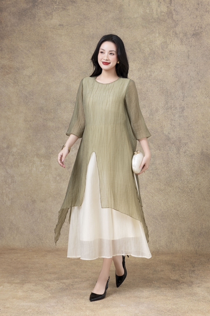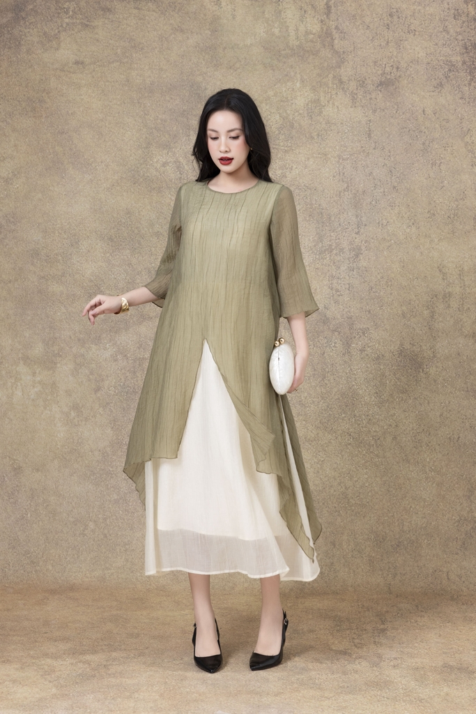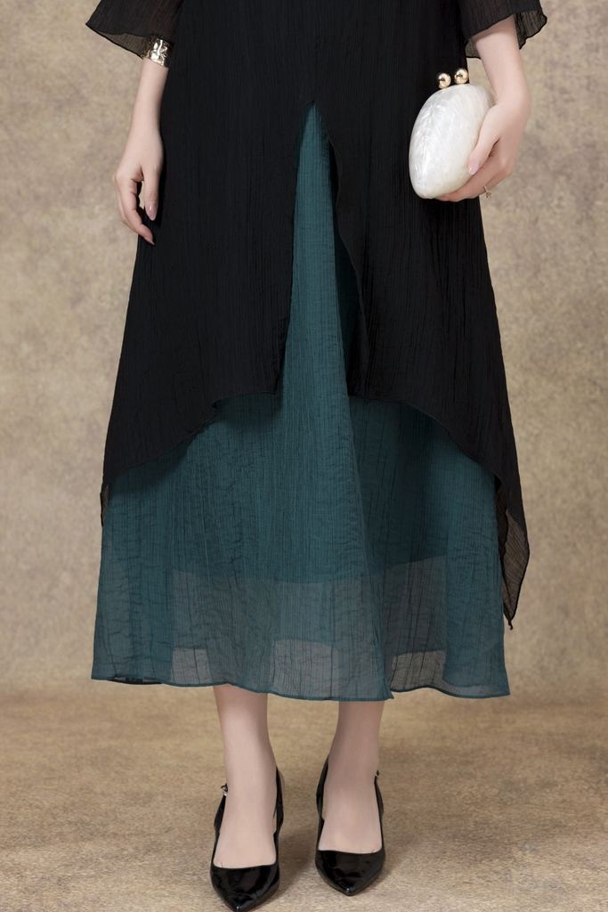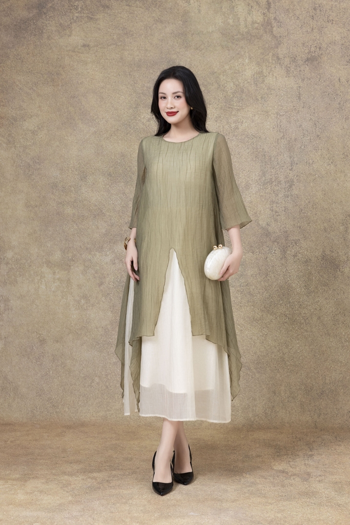 SWANLAKE | Váy Đầm Maxi Suông Nữ Xẻ Tà Tay Lỡ Cổ Tròn Vải Tơ Dập Ly Cao Cấp Đi Tiệc Công Sở D13235LW01