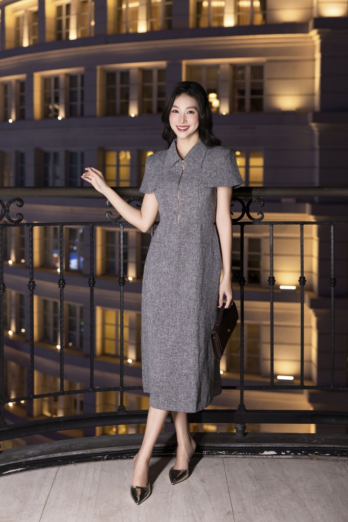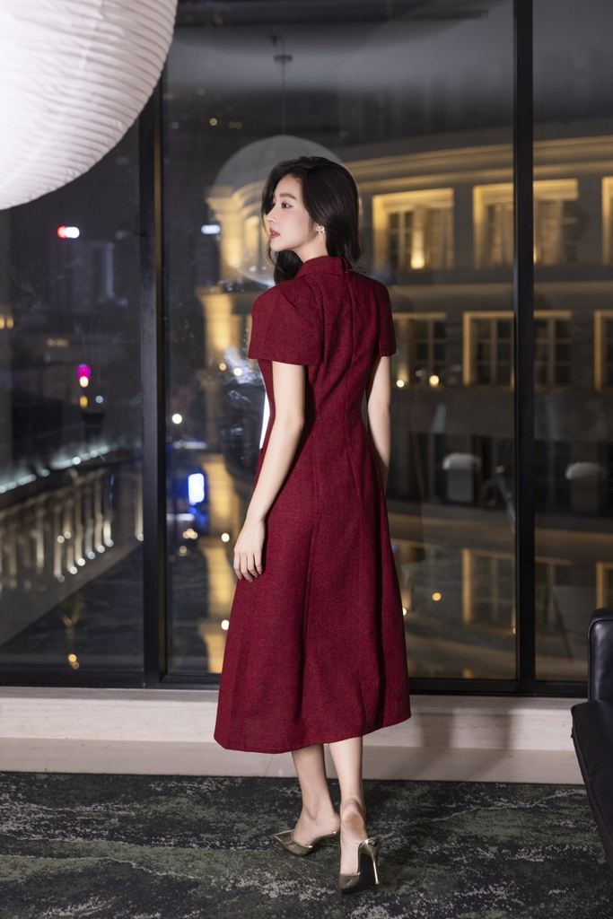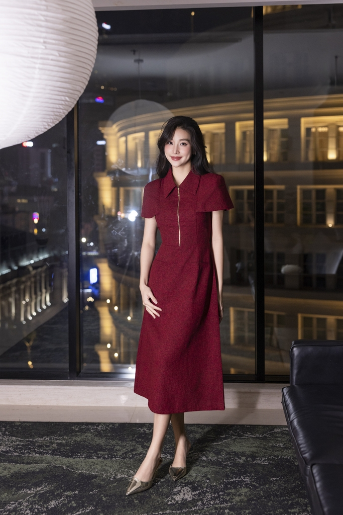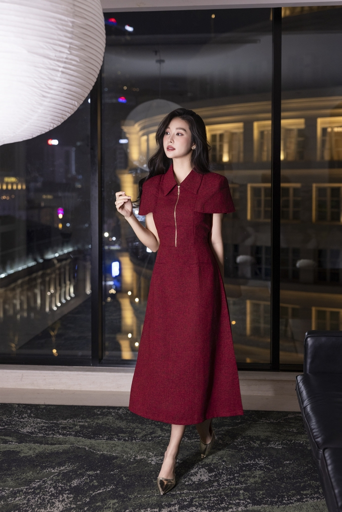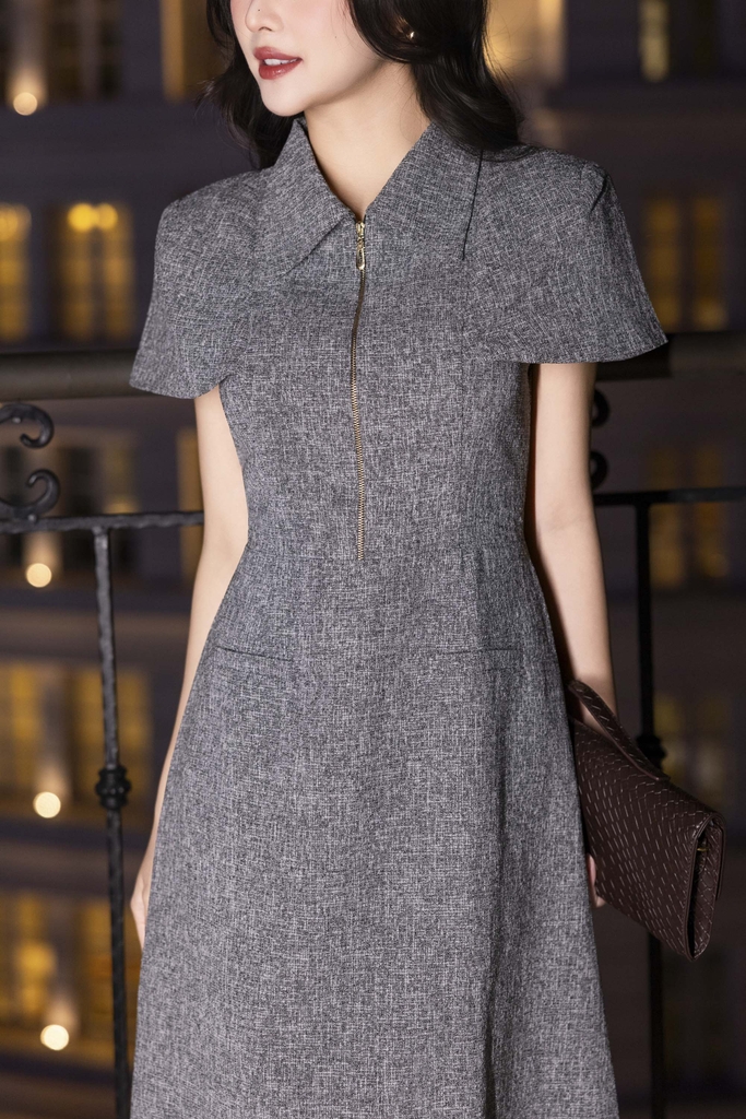 SWANLAKE | Váy Đầm Midi Nữ Chất Vải Dạ Cổ Sơ Mi Khóa Kéo Tay Ngắn Nhấn Eo Công Sở Đi Tiệc D13353MW01 Vải Nỉ