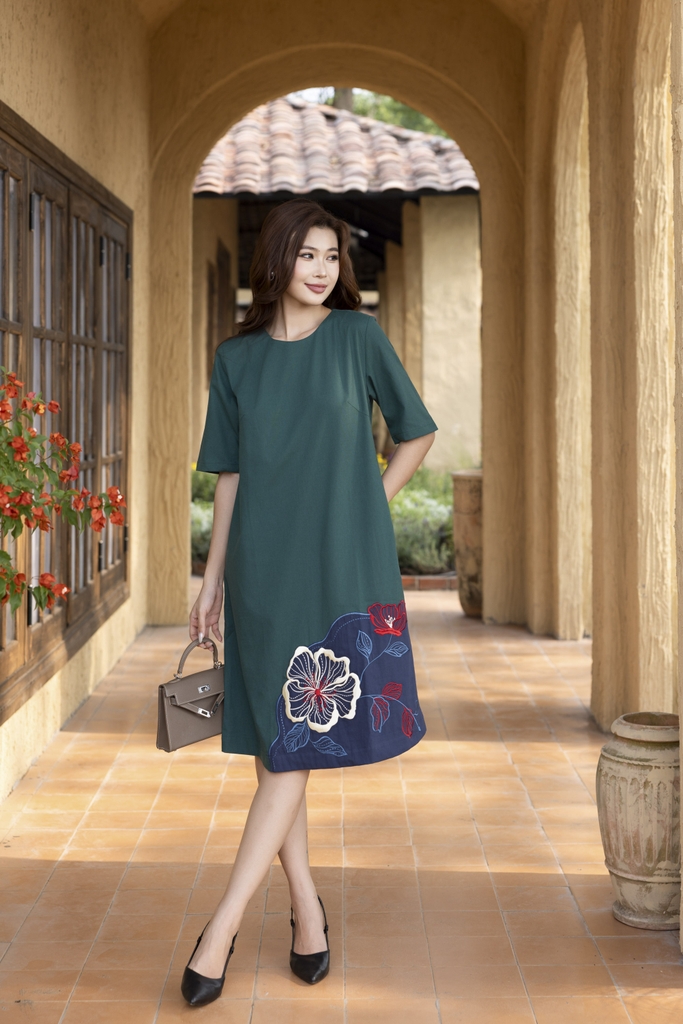 SWANLAKE | Váy Đầm Midi Nữ Phom Suông Cổ Tròn Tay Ngắn Thêu Hoa Chất Vải Linen Dạo Phố D13187LW01