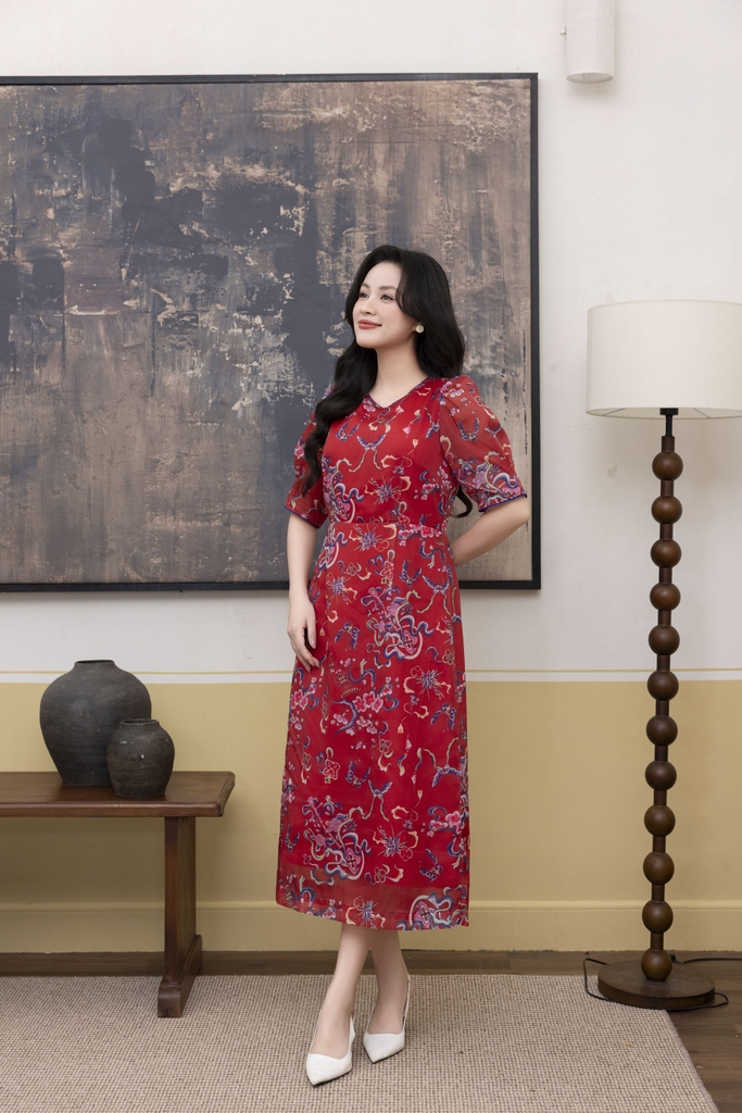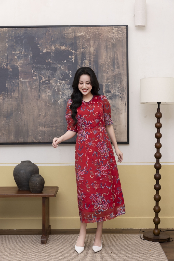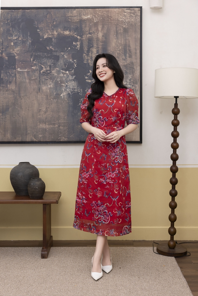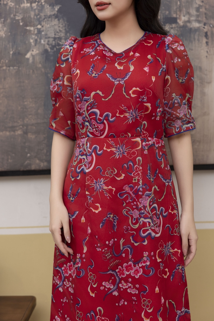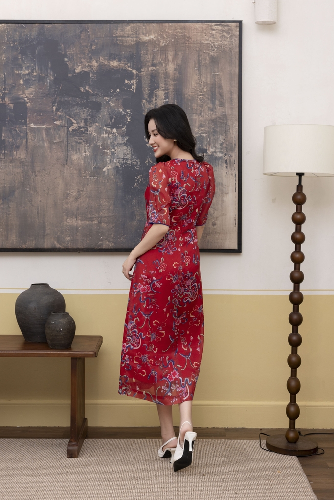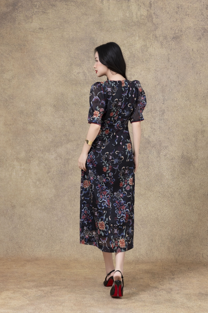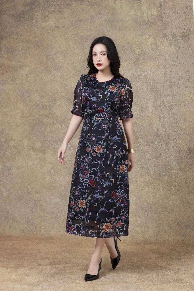 SWANLAKE | Váy Đầm Nữ Maxi Suông Vải Tơ In Hoa Cổ Tròn Tay Bí Phồng Chiết Eo Đi Tiệc Công Sở D13245LW01