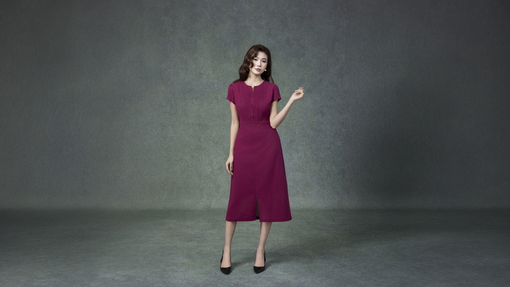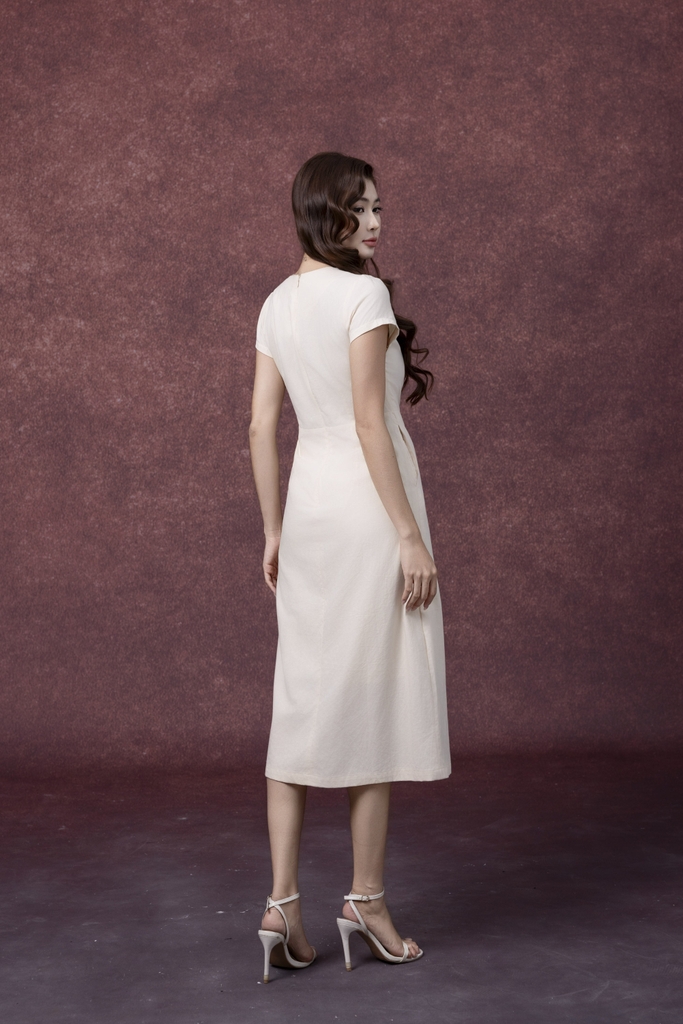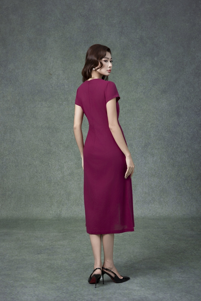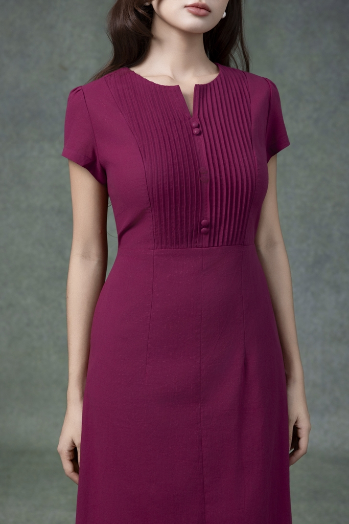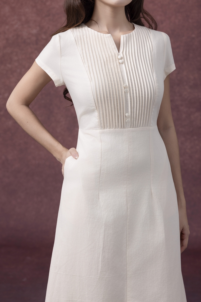 SWANLAKE | Váy Đầm Nữ Midi Cổ Chữ V Cài Nút Xếp Ly Vải Linen Tay Ngắn Thắt Eo Xẻ Tà Công Sở D13288LW01