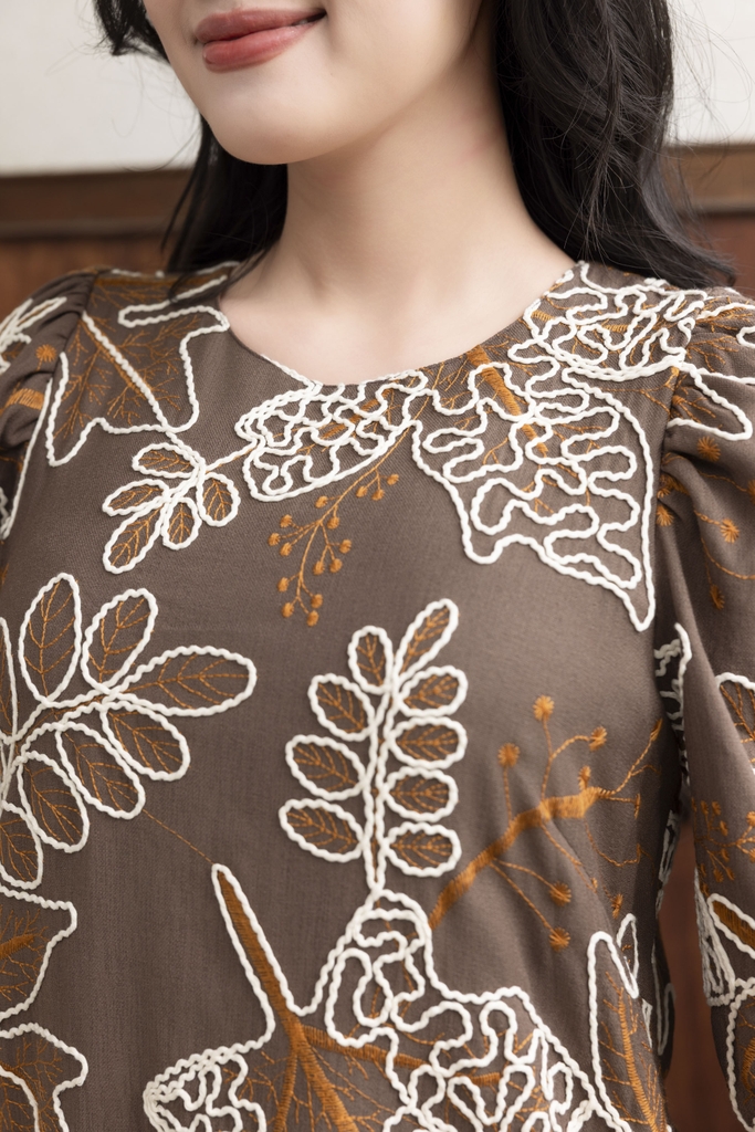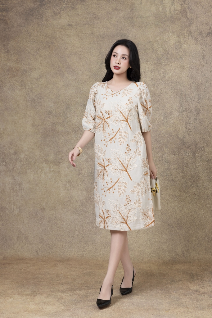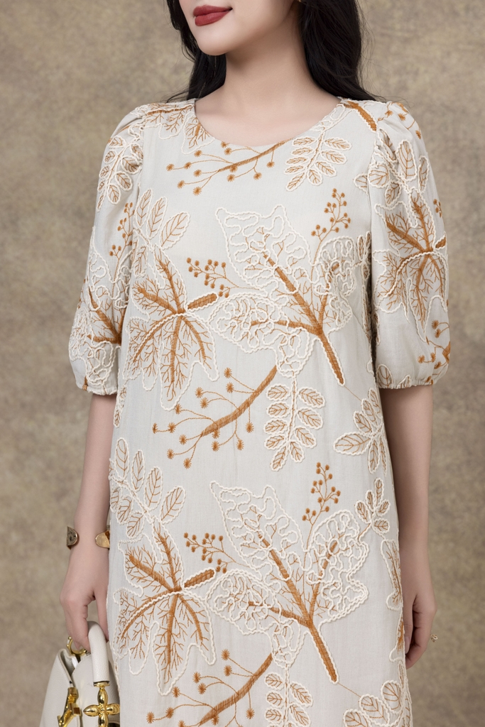 SWANLAKE | Váy Đầm Nữ Midi Phom A Tay Bí Lỡ Phồng Cổ Tròn Vải Đũi Thêu Hoa Dự Tiệc Công Sở D13292LW01