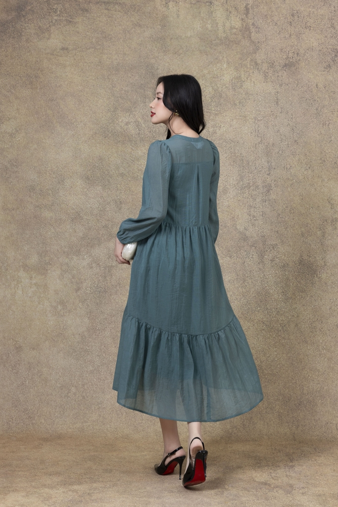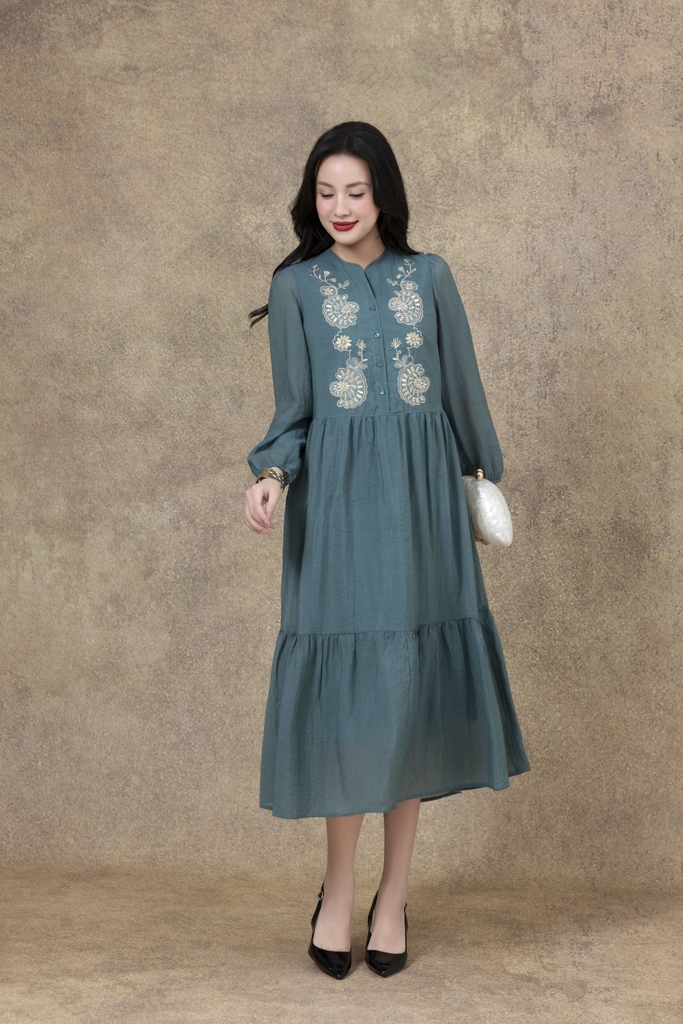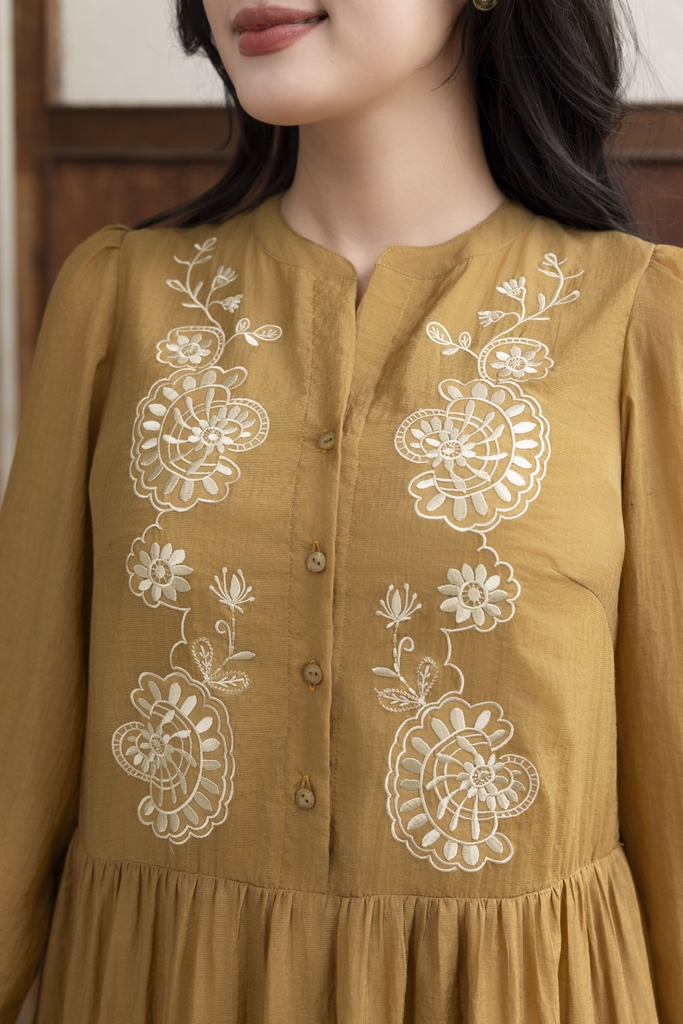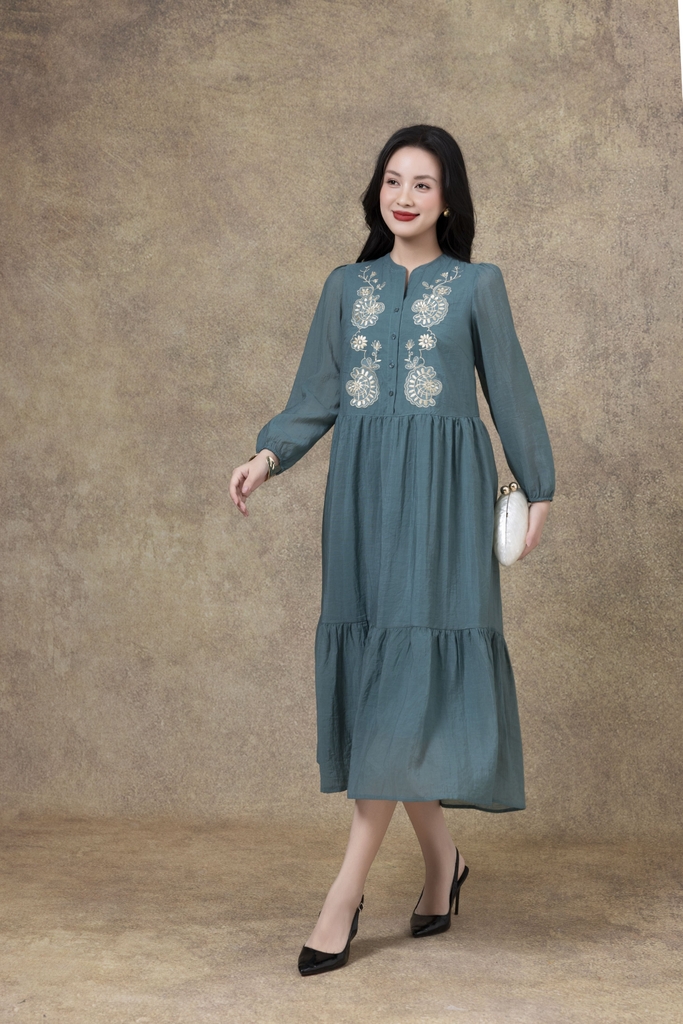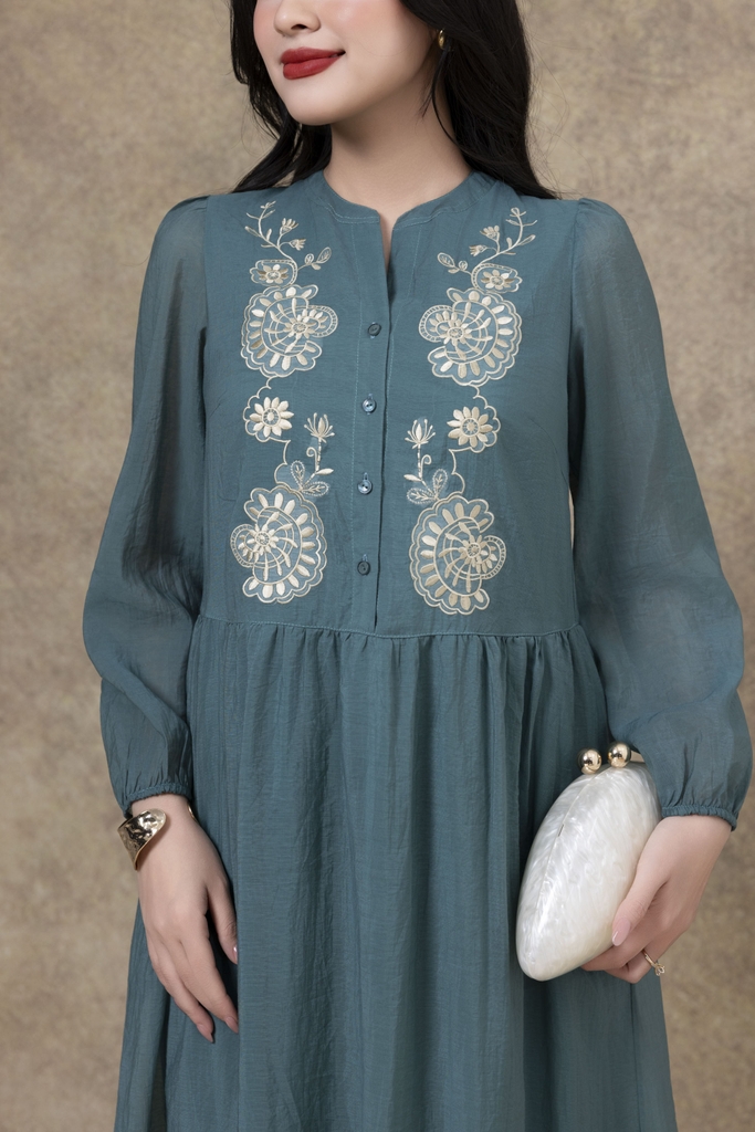 SWANLAKE | Váy Đầm Nữ Suông Đuôi Cá Vải Tơ Thêu Hoa Cao Cấp Tay Dài Cổ V Cài Nút Đi Tiệc D13281LW01