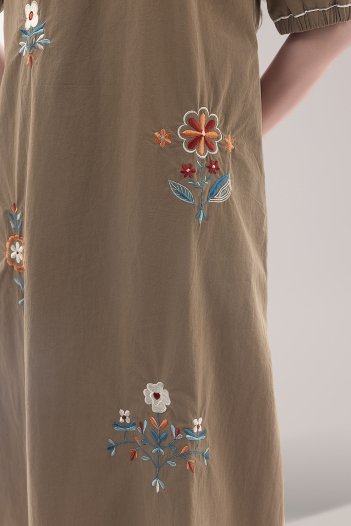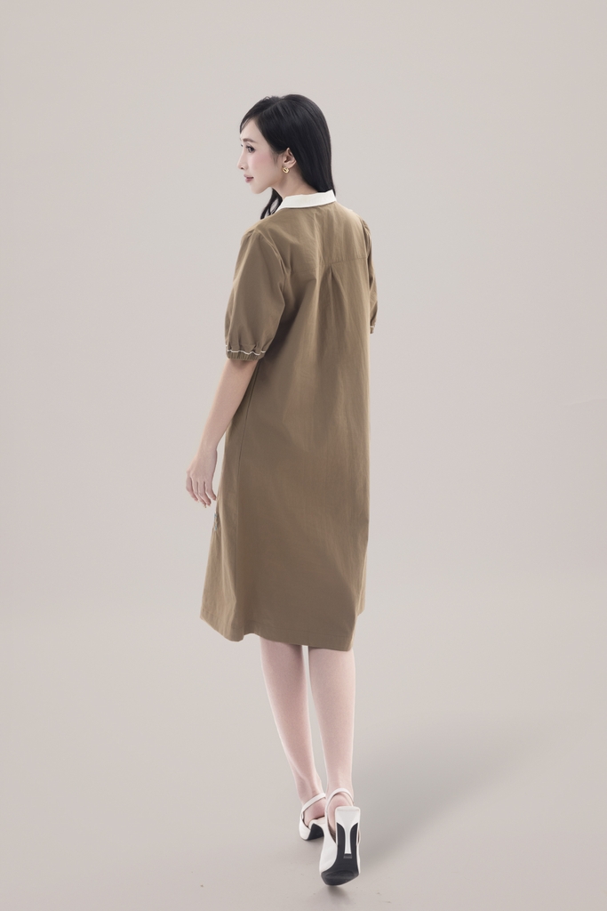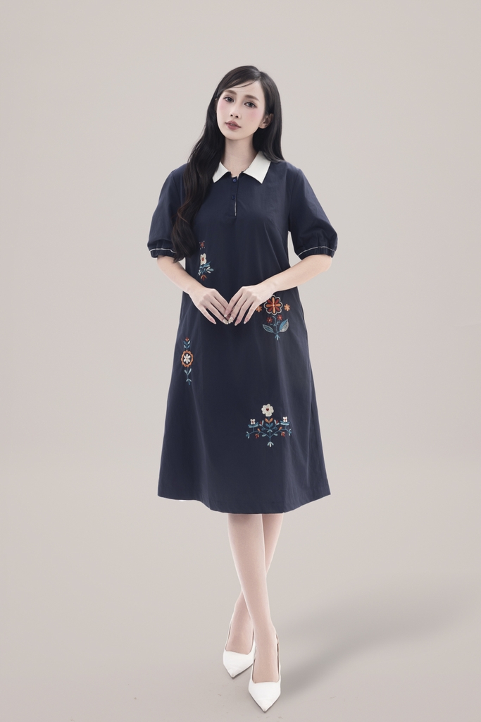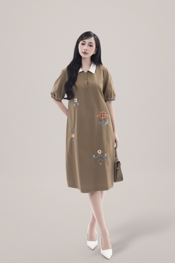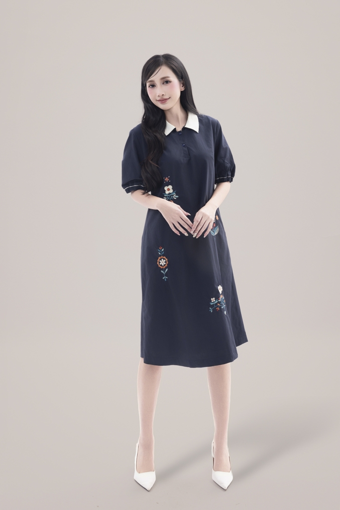 SWANLAKE | Váy Đầm Nữ Suông Vải Cotton Thêu Hoa Cổ Sơ Mi Tay Ngắn Phồng Công Sở Thanh Lịch D13077LW01